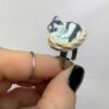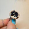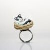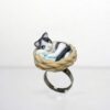 Each ring features a handmade cat curled up in a textured basket, sculpted from durable polymer clay and mounted on an adjustable stainless steel band. Every detail is shaped by hand, from the pose to the fur pattern, with no molds or shortcuts.