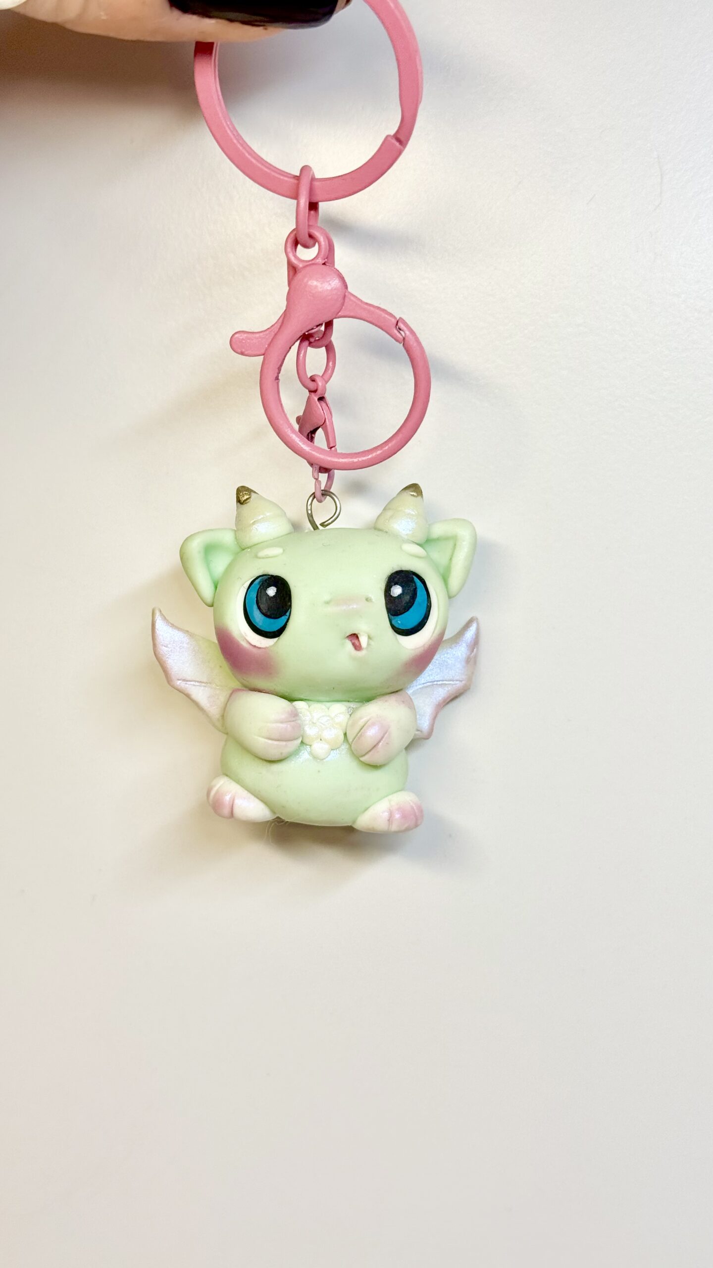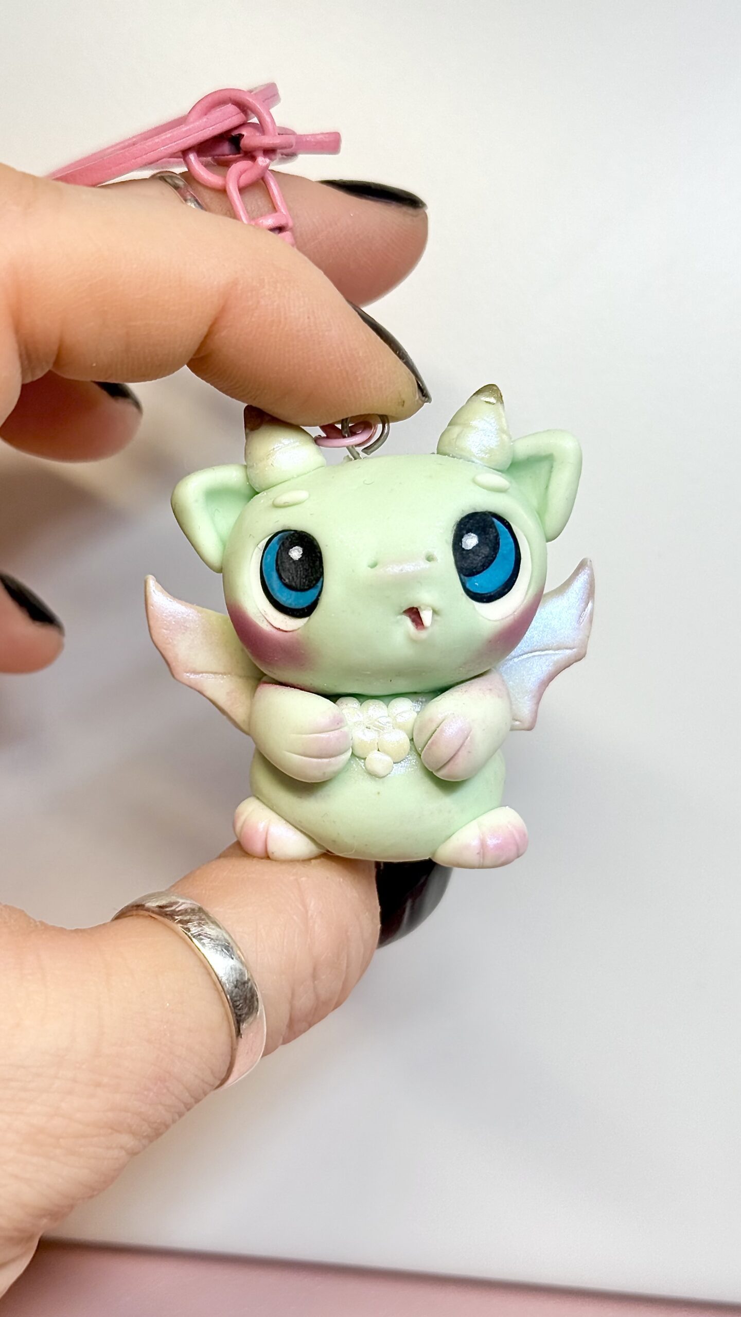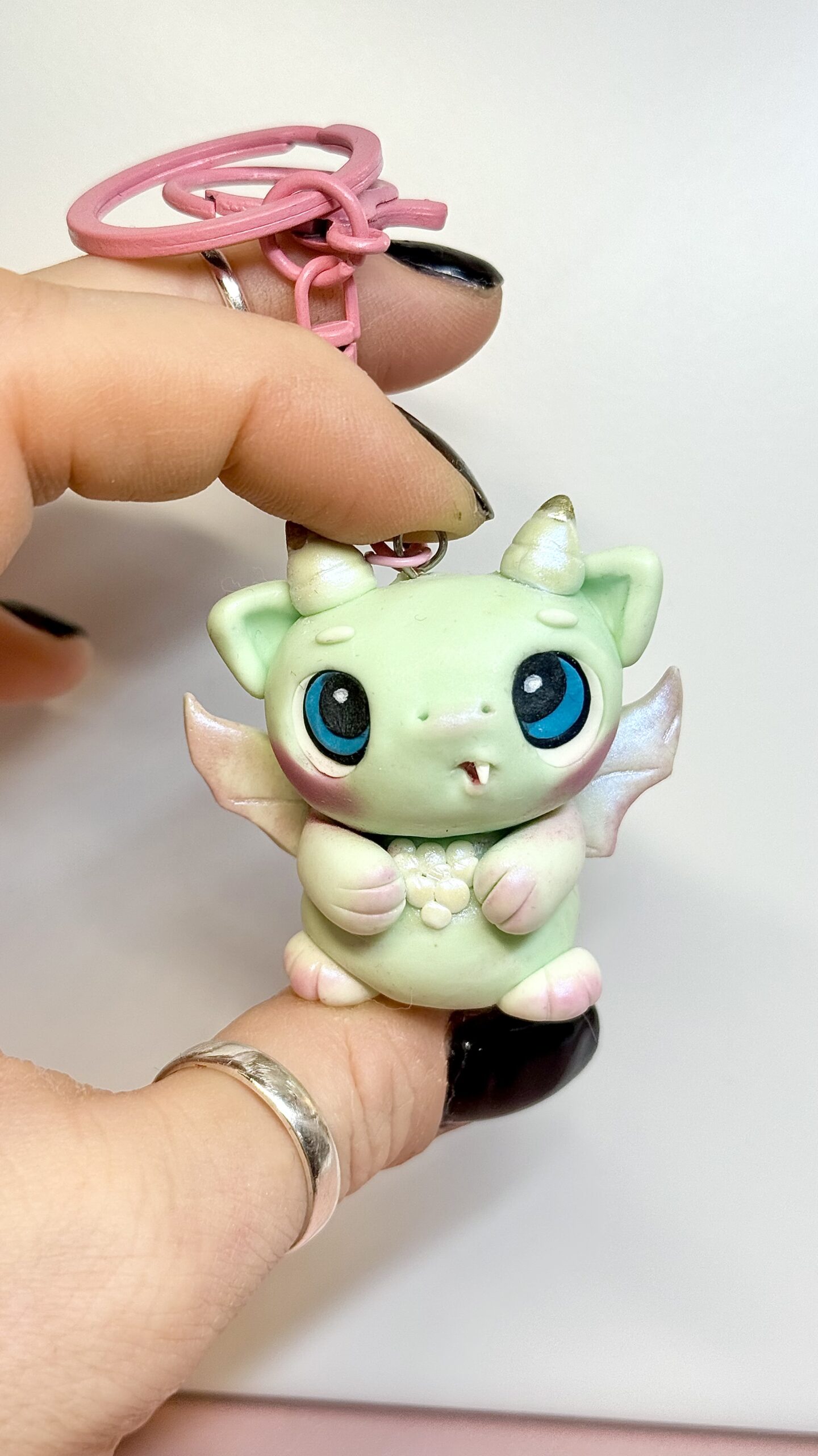 This dragon monster keychain is handmade from polymer clay, sculpted and finished entirely by hand. Each piece is shaped, baked, and sealed with a protective finish, making every character slightly different.