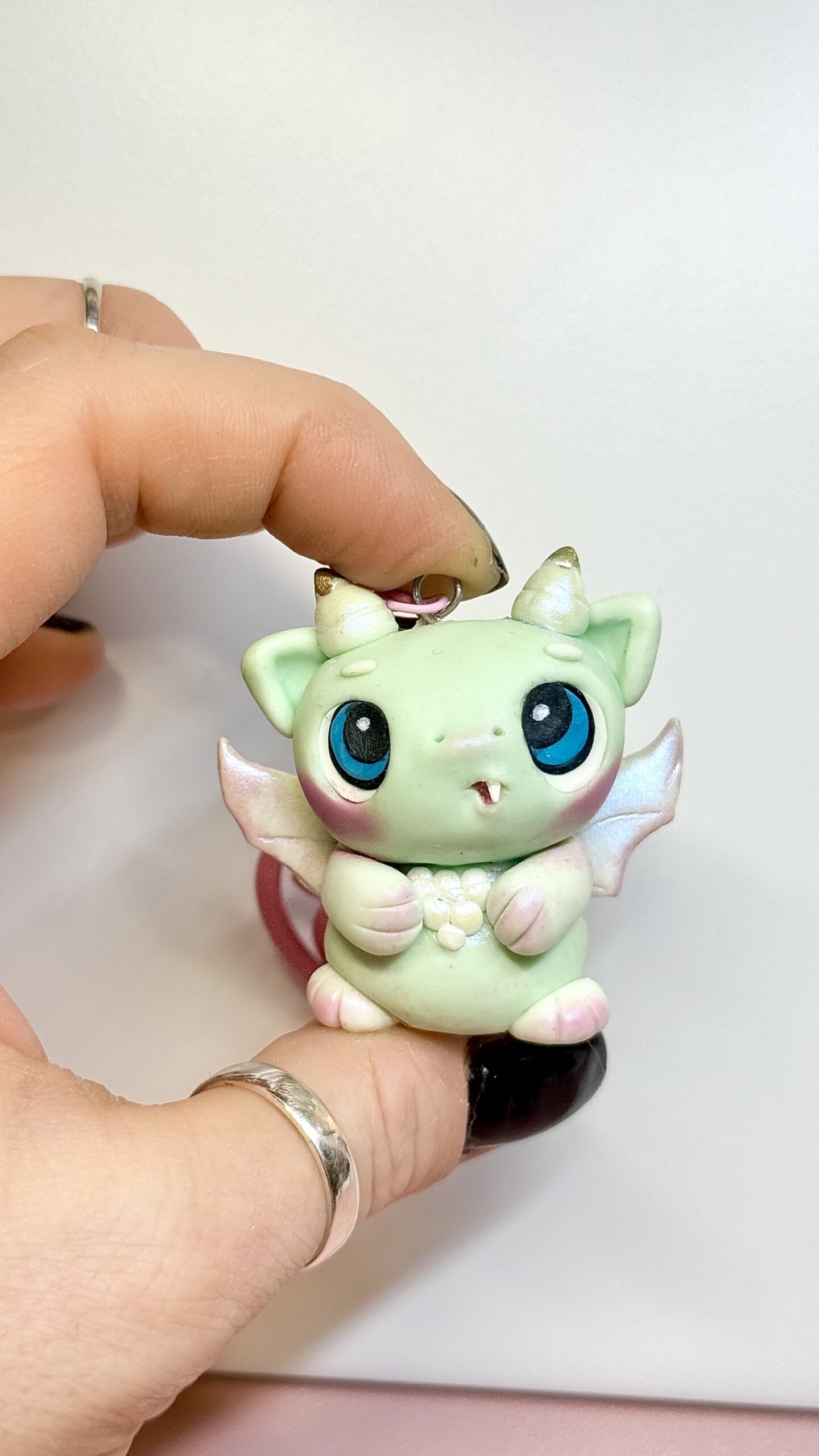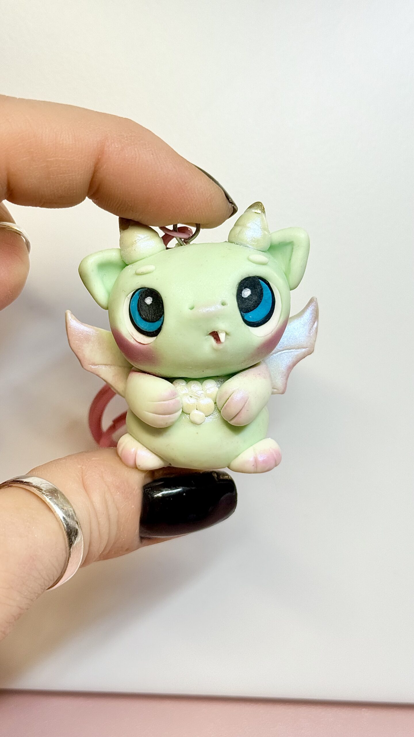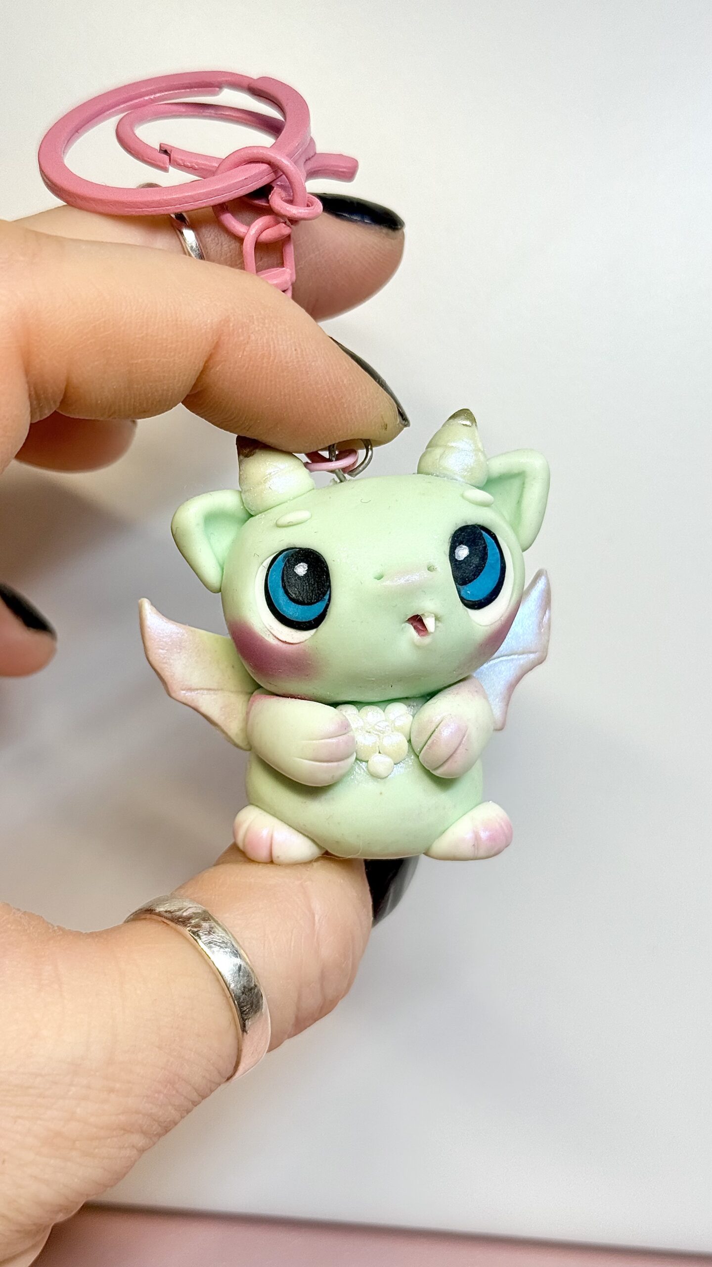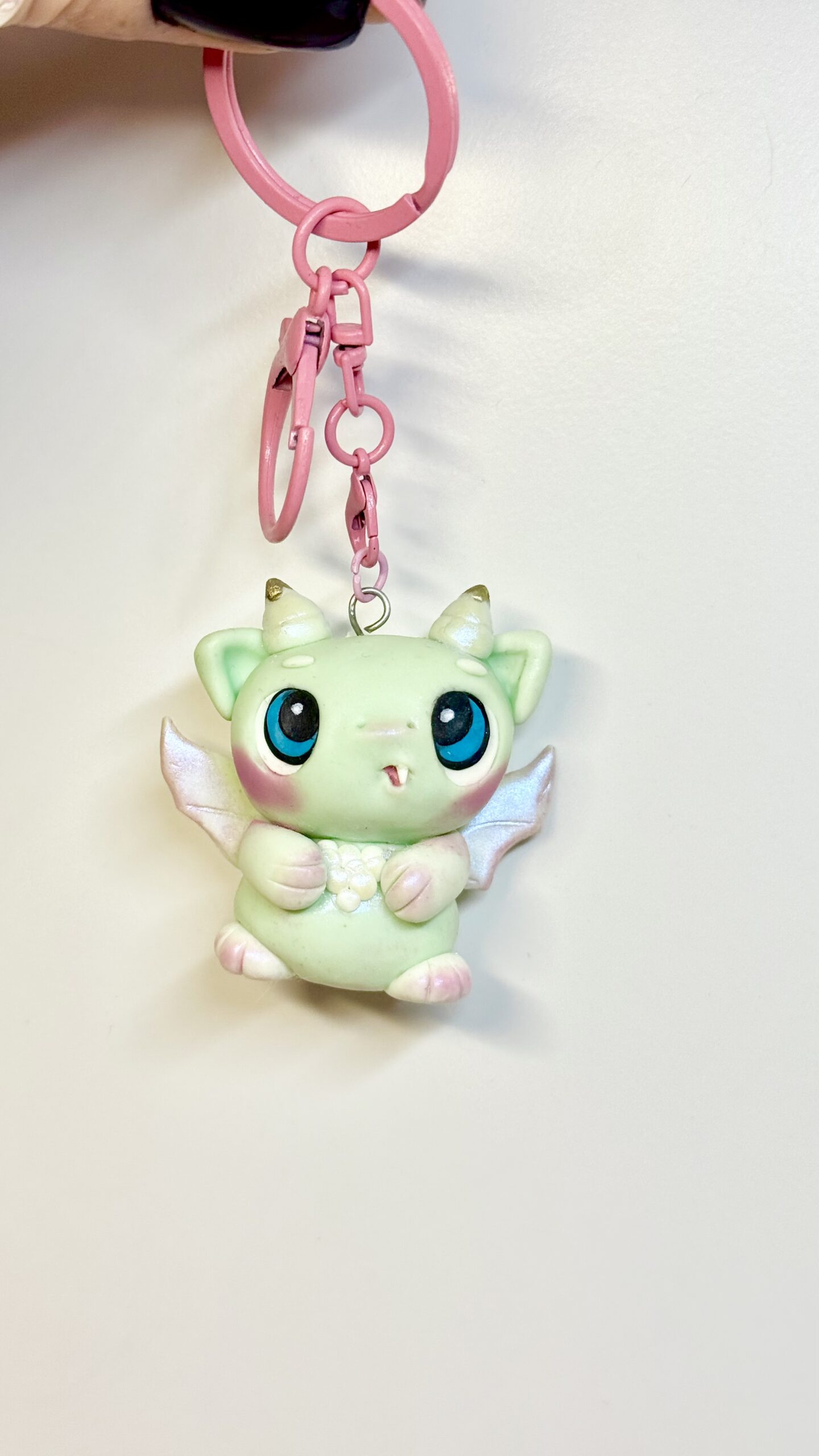 This dragon monster keychain is handmade from polymer clay, sculpted and finished entirely by hand. Each piece is shaped, baked, and sealed with a protective finish, making every character slightly different.