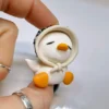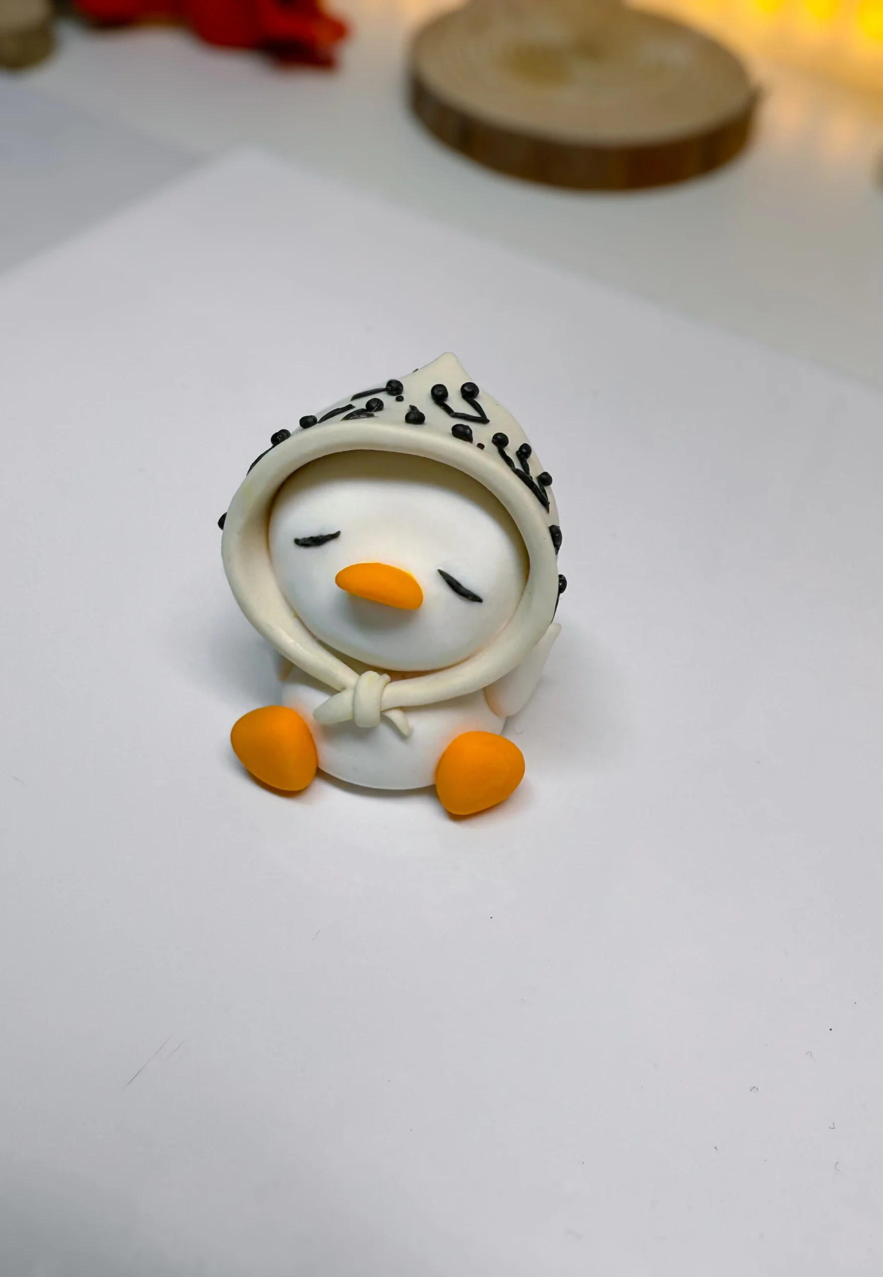 She wears a soft hooded scarf decorated with miniature music notes and is designed as a calm little desk buddy who brings a quiet rhythm to any workspace.