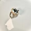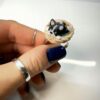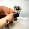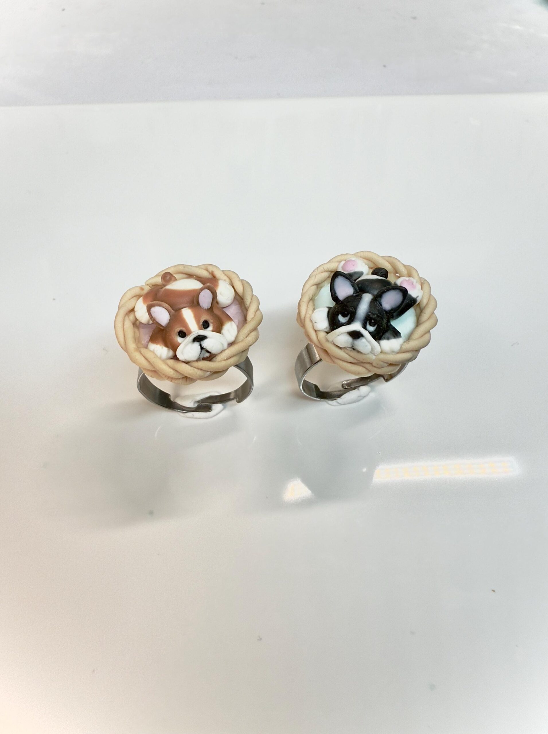 Handmade from polymer clay with too much coffee and tiny tools, this ring features a miniature black and white bulldog resting in a braided basket — mounted on an adjustable stainless steel base.